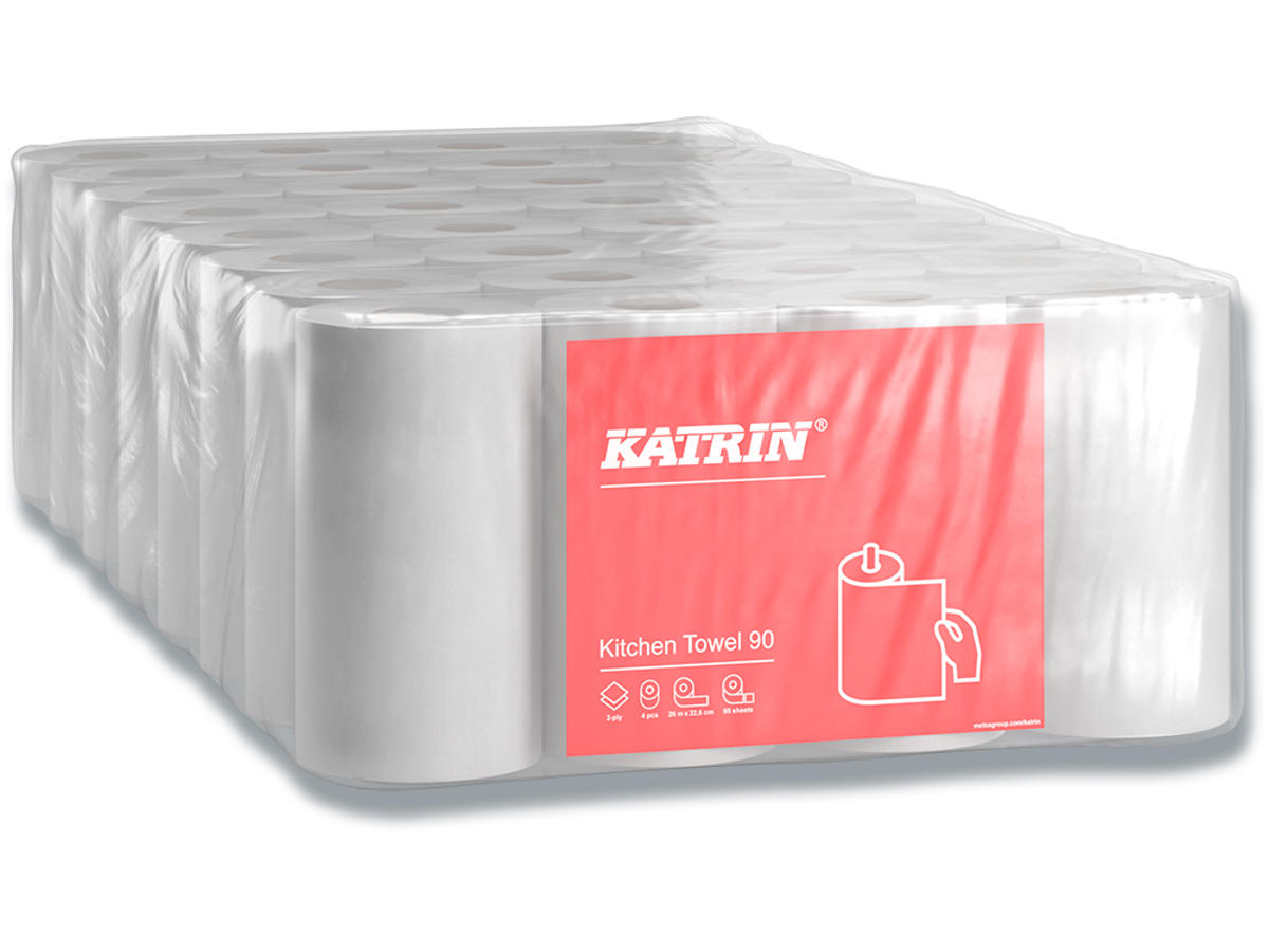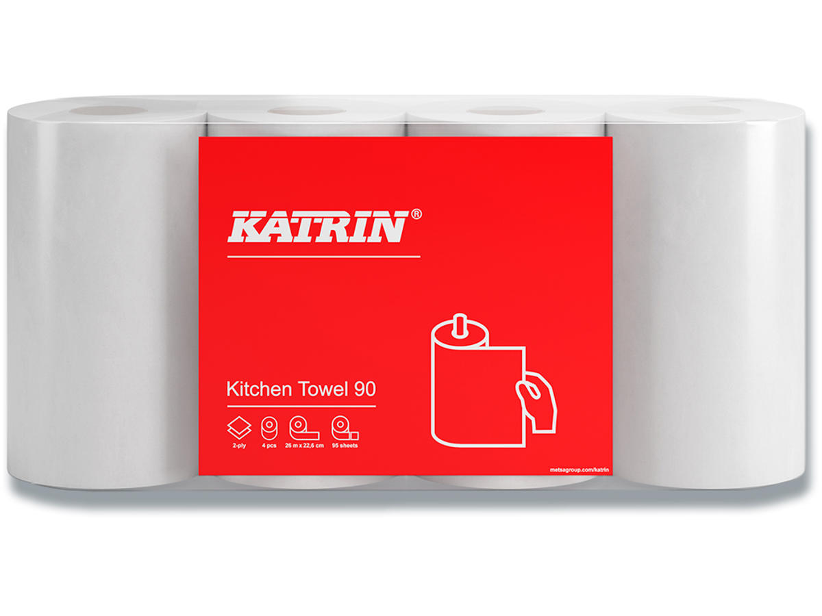Katrin køkkenrulle 90 dækker de basale behov. Rullen er 2-lags i farven natur og baseret på en høj andel genbrugsfibre.