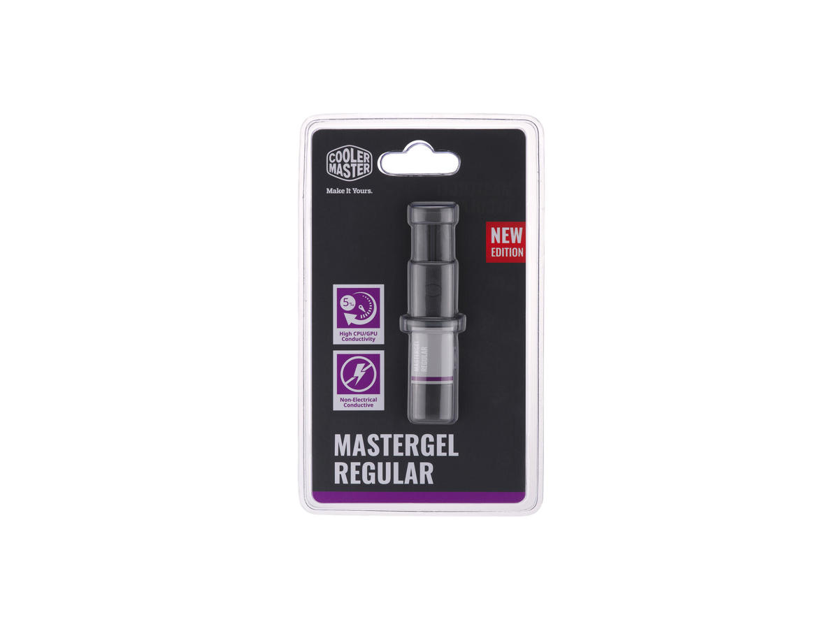 Cooler Master MasterGel Regular. Type: Termisk pasta, Termisk ledningsevne: 5 W/mK, Tæthed: 2,5 g/cm³. Volumen: 1,5 ml, Vægt: 12 g. Antal pr. pakke: 1 stk, Pakketype: Blister