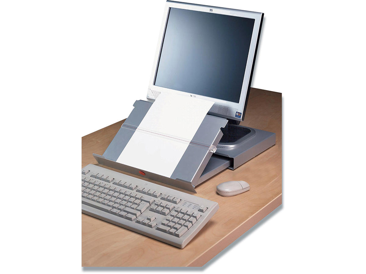 Placeres under skærmen. Meget lav, højde kun 25mm. Synsafstand og vinkel kan indstilles. Giver ekstra plads , da læsepladen kan skydes ind under skærmen. Mål: 380 x 380mm. Læsepladen har målene: 240 x 380mm.