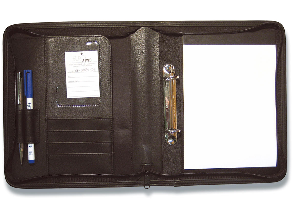EUROSTYLE Konferencemappe A5 i sort kunstlæder med lynlås lukning. Str.: 35.7 x 22 x 3.5 cm. 2-ringe Ø 25 mm. Plads til 2 penne og kort samt praktisk siderum. A5 papirblok medfølger.