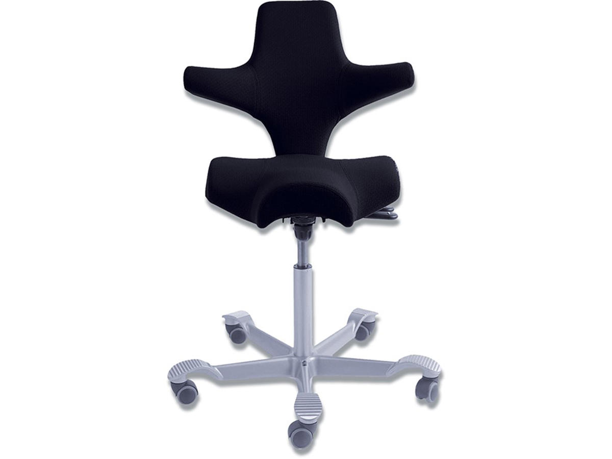 Denne Capisco 8106 model leveres i sort SELECT polstring og sølvfarvet fodkryds. Vi har også andre varianter med sort stel og i andre farver.