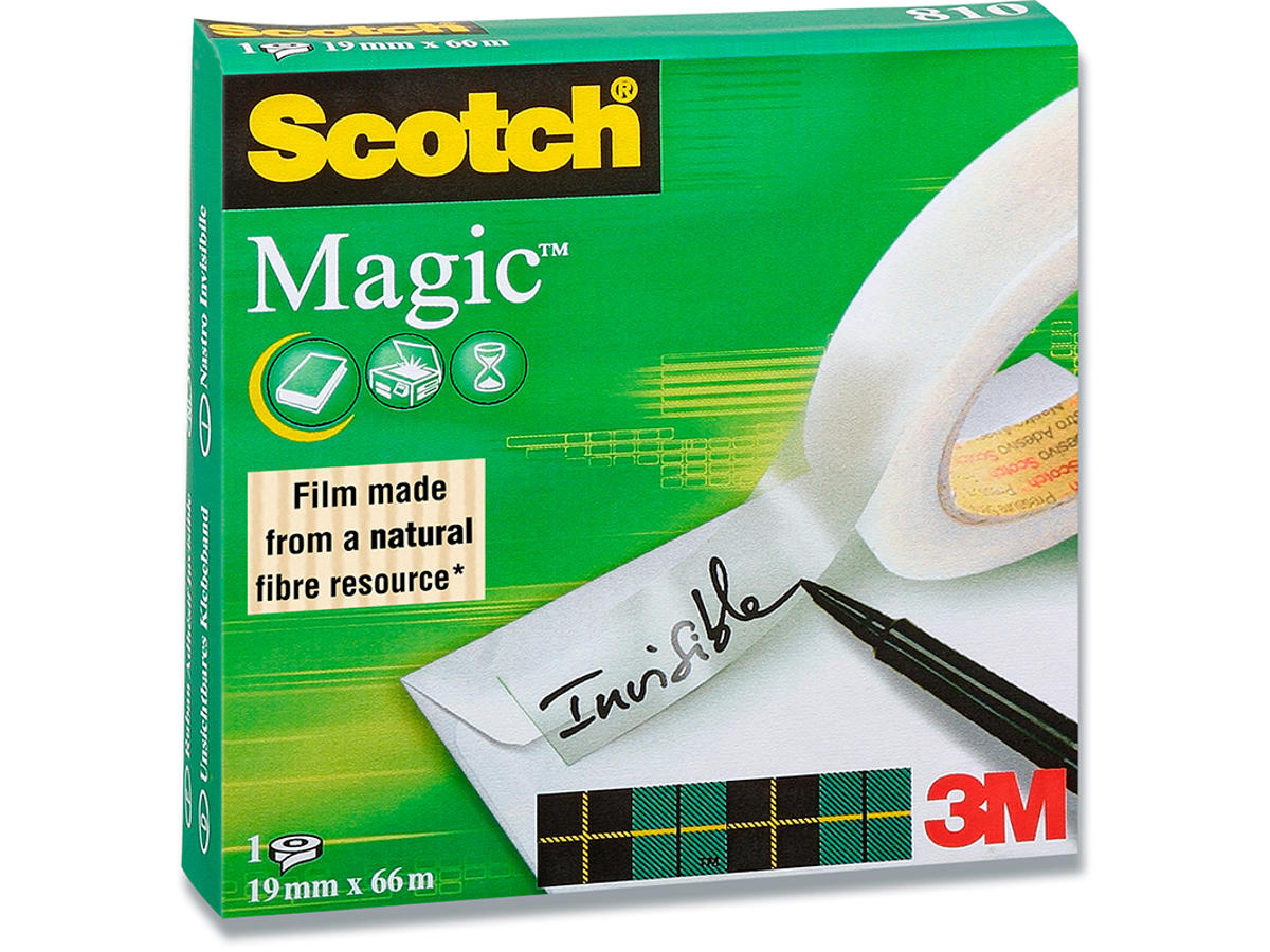 En usandsynlig populær tape med vandbaseret klæbestof, som har en langvarig klæbeevne. Magic tape er fremstillet af naturlige fibre som er nem at rive over i dispenser. Bredden på denne lækre tape er 19 mm og den anvendes både på mange kontorer samt i mange hjem. Det specielle ved denne tape er, at den er usynlig når den placeres på papir. Tapen vil ligeledes ikke kunne ses ved fotokopiering og i forhold til andre typer tape, gulner denne Magic tape ikke. På tapen kan der både skrives med kuglepen, tusch og blyant. Scotch Magic Tape 810 forhandles i æske med 12 ruller som hver især indeholder 66 meter.