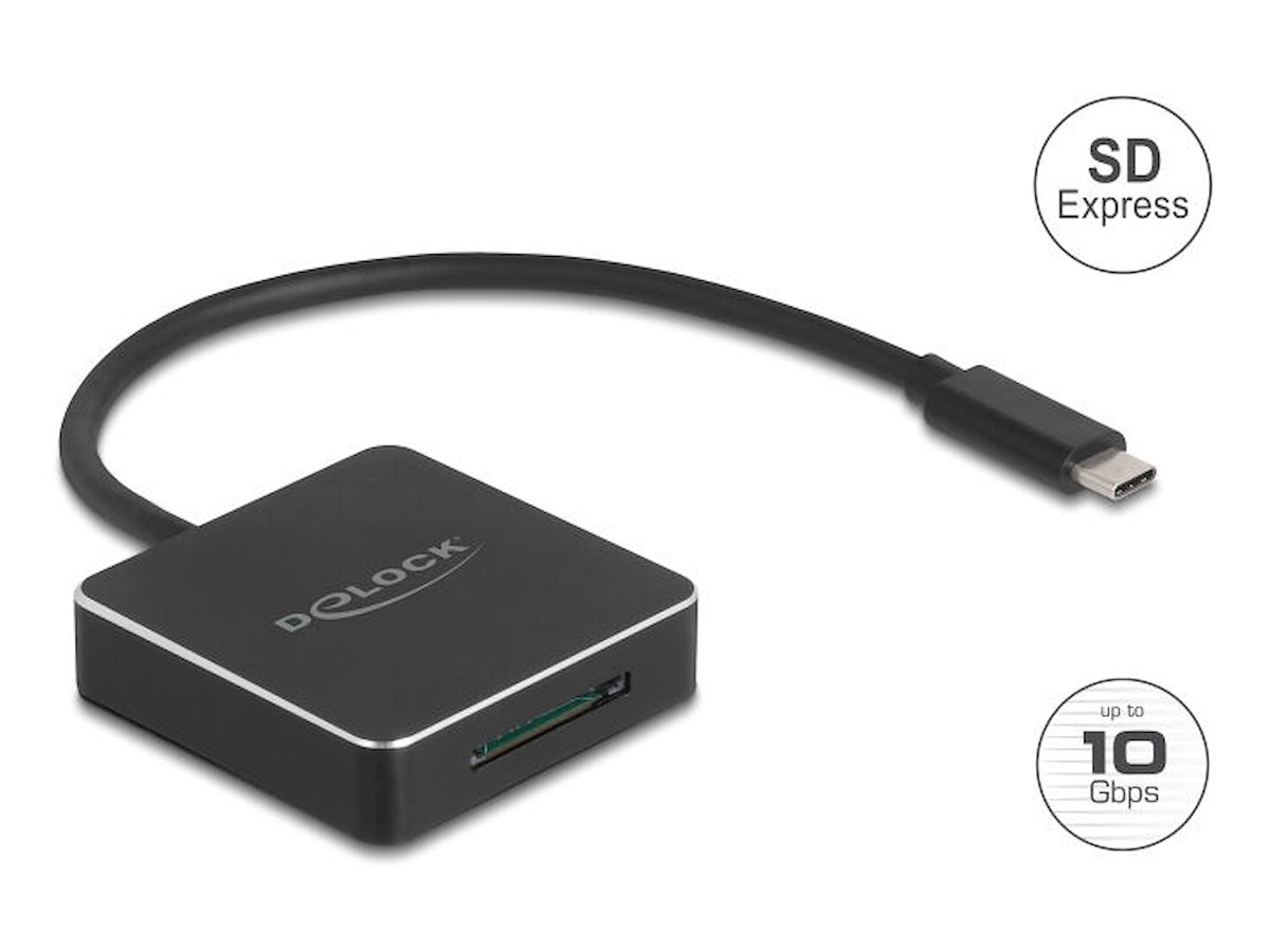 DeLOCK 91019. Kompatible hukommelseskort: SD, SDHC, SDXC, Produktfarve: Sort, Dataoverførselshastighed: 10000 Mbit/s. Grænseflade: USB 3.1 (Gen 2) Type C. Bredde: 54 mm, Dybde: 54 mm, Højde: 14 mm. Antal pr. pakke: 1 stk, Pakketype: Hængende boks. Understøttede Windows-operativsystemer: Windows 10, Windows 11, Understøttede Linux-operativsystemer: Linux Kernel 6.5, Ja, Kompatible operativsystemer: Chrome OS Surface Pro 7 Windows 10 32-Bit Windows 10 64-Bit iPad Pro iPad Air