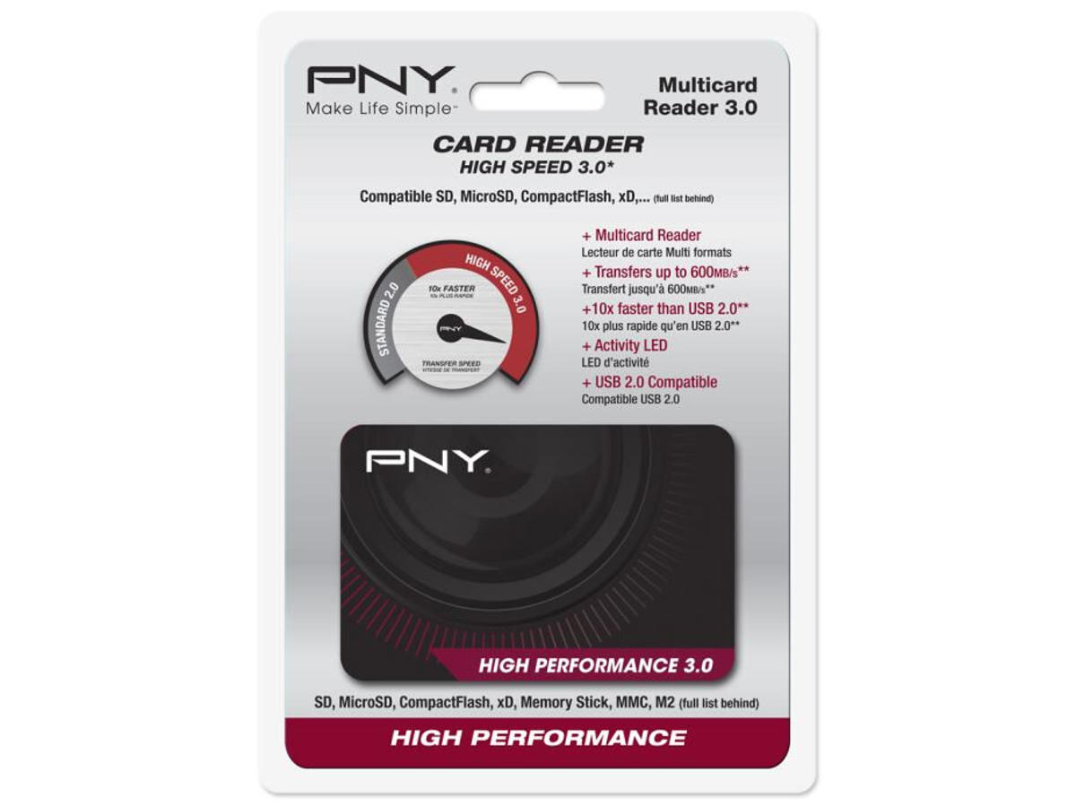 PNY High Performance Reader 3.0. Kompatible hukommelseskort: Kompakt flash (CF), Hukommelsesstick (MS), MicroSD (TransFlash), microSDHC, microSDXC, miniSD,..., Produktfarve: Sort, Dataoverførselshastighed: 5000 Mbit/s. Grænseflade: USB 3.2 Gen 1 (3.1 Gen 1). Kabler inkluderet: USB