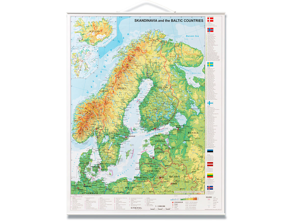 Kort over Skandinavian incl. de Baltiske lande 97 x 67 cm. Lamineret, med skriv/visk ud funktion. Ridsefast overflade. Metalskinner og ophængssnor. Leveres rullet sammen i et plastik rør.