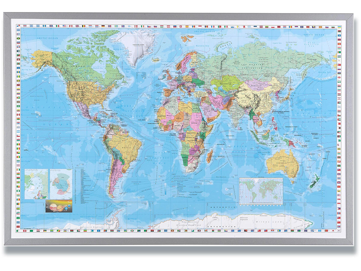 Indrammet Verdens kort 60 x 90 cm. Med sølvfarvet MDF ramme. Dette kort kan bruges med pins. Incl. 6 flag pins.