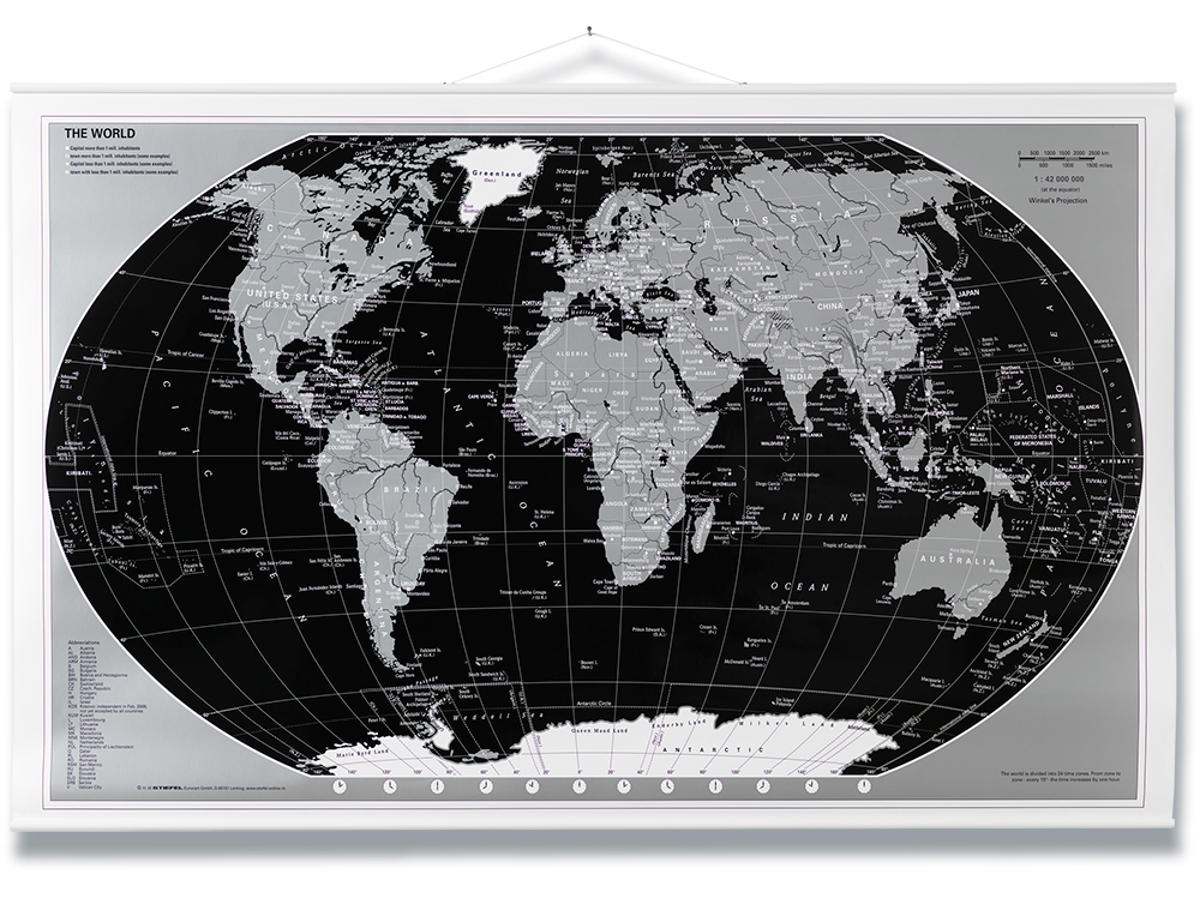 Verdens kort 92 x 67 cm i flot sort/sølv design. Lamineret, med skriv/visk ud funktion. Ridsefast overflade. Metalskinner og ophængssnor. Leveres rullet sammen i et plastik rør.