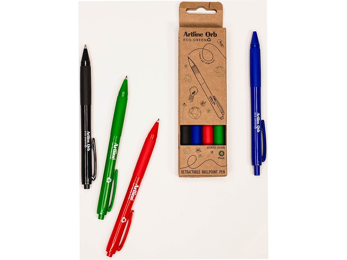 Artline ECO-GREEN Kuglepen: Lav viskositet. Superglat skrivning. Livlige farver. Lommeclip. Gummigreb. Fremstillet af indsamlet genbrugsplast fra forbrugere.