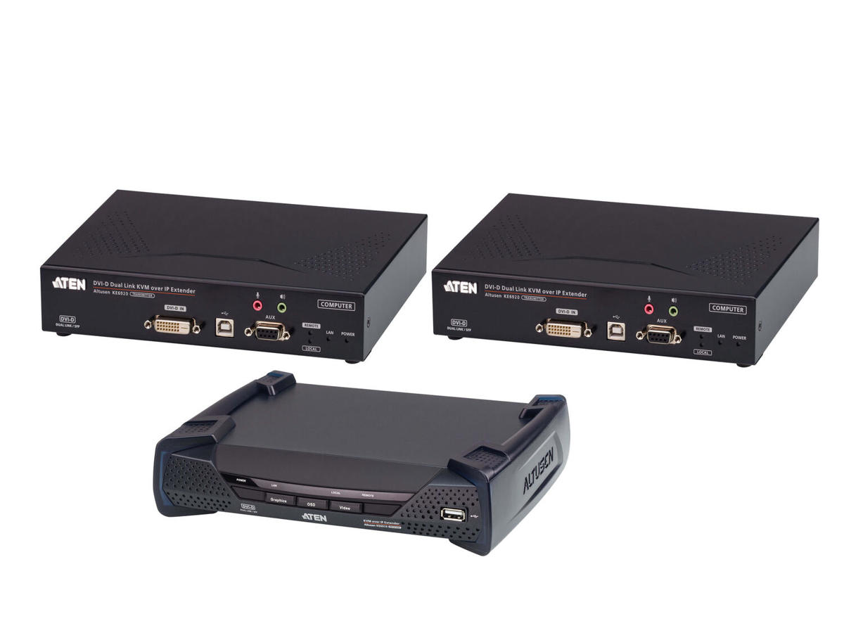 ATEN KE6920 Air Traffic Control Bundle Solution consists of two high performance IP-based transmitters (KE6920T) that connect to two PCs / servers and an IP-based receiver (KE6920R), providing console access from a separate location. The solution builds effortless IP extension that eliminates the distance restrictions of control room management, enabling a faster response to mission-critical data center emergencies. With Primary-Secondary Architecture, the KE6920 Air Traffic Control Bundle Solution enables connection to a primary and a secondary computer that allows instant system failover via hotkey switching without moving around workstations. The deployment of ATEN KE6920 Air Traffic Control Bundle Solution allows access to a computer system from a remote USB console (USB keyboard / mouse and DVI monitor) over the intranet, allowing the computer to be located in a secure and temperature controlled environment, which is also isolated from the user workstation.