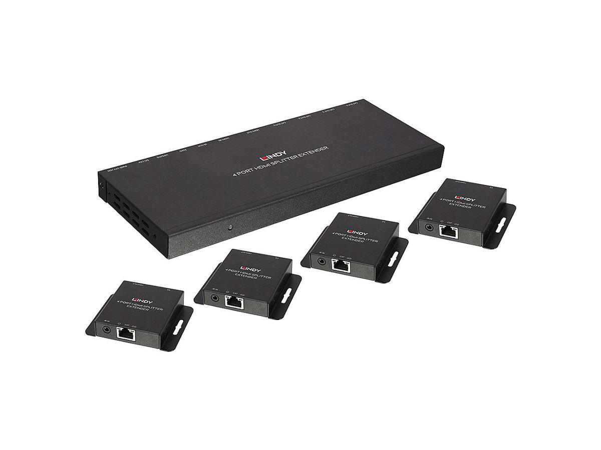 The Lindy 70m Cat.6 4 Port HDMI and IR Splitter Extender is a simple to use plug and play solution that allows users to extend an HDMI signal up to 70m and then distribute that signal to four displays using low cost Cat.6 UUTP cable (not included). For added convenience IR signals (20-60kHz) can also be extended using the supplied IR receiver and emitter cables.
