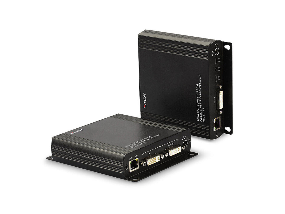 The Lindy Cat.6 DVI-D Single Link, USB, Audio and RS-232 KVM Extender allows users to control a source device such as a PC from a single keyboard, mouse and display up to 140m using a Cat.6 RJ-45 cable. Supports single link resolutions up to 1920x1200 and HDMI signals including Full HD 1080p, 3D and HDCP 1.4. Ideal for KVM applications, the Extender consists of a transmitter and a receiver unit. The transmitter must be connected to a source such as a PC or KVM Switch, while the console with display, keyboard and mouse must be connected to the receiver. It's also possible to connect additional USB 2.0 devices such as storage and hard drives (webcams are not supported).