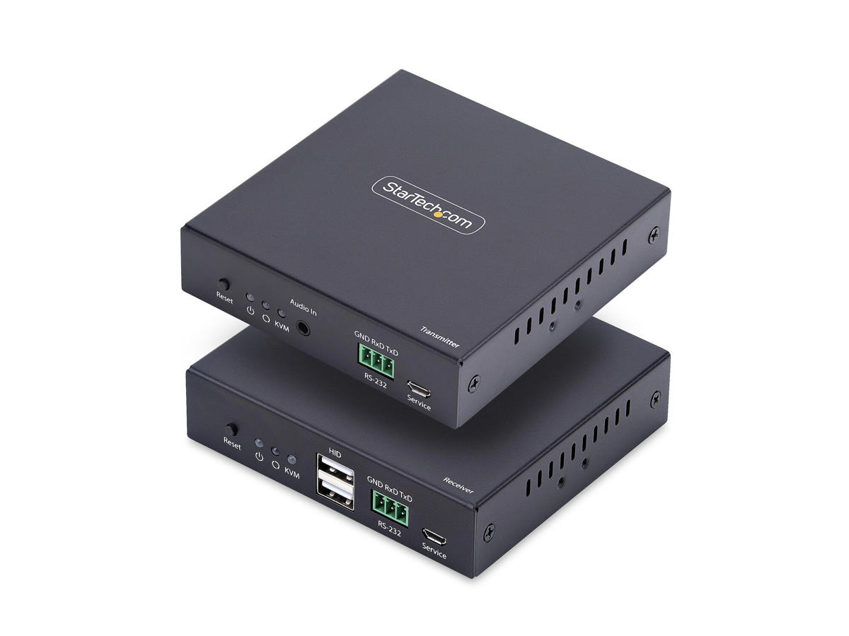 Each unit features a durable metal housing with mounting kits for wall or under-desk installation, plus rubber feet for desktop stability. A local HDMI output on the transmitter allows direct connection to a nearby display, while RS232 and 3.5mm audio passthrough ports enable serial and audio extension.