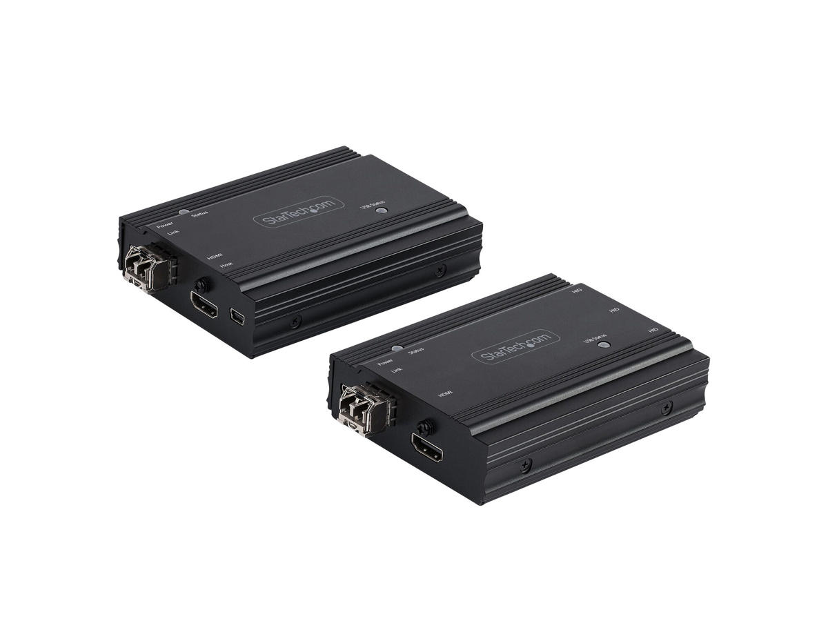 This HDMI KVM extender kit lets you use a keyboard, mouse and monitor to remotely control any computer over a point-to-point fiber connection. When combined with a KVM switch, the KVM console extender can be used with multiple computers. The extender features three USB HID ports that enable you to connect HID devices, like your keyboard and mouse.