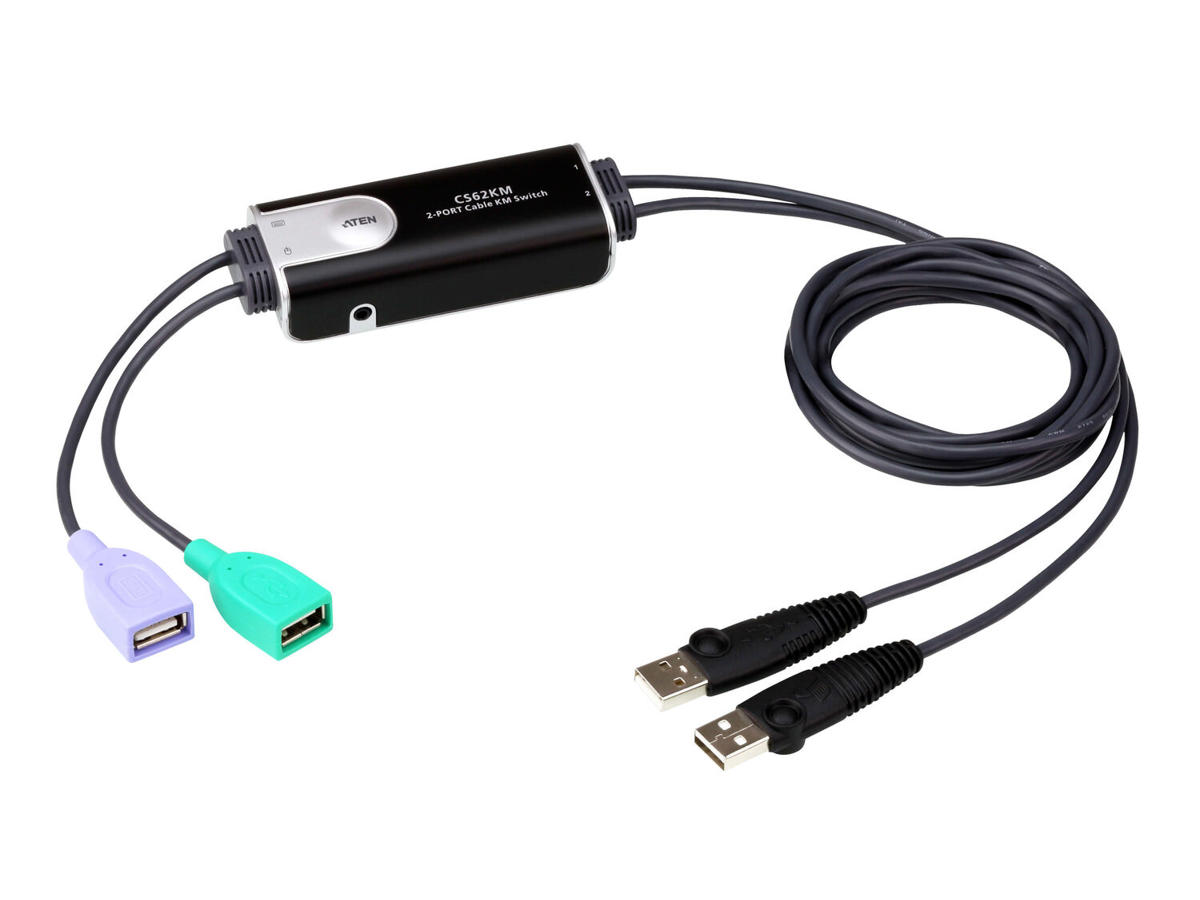 The ATEN CS62KM is a 2-port USB Cable KM Switch that enables users to control up to 2 computers with a single keyboard and mouse. The CS62KM offers various innovative port selection methods for users to switch between the connected computers via remote port selector, keyboard hotkey, mouse cursor, and mouse wheel. The mouse cursor method adopts ATEN’s exclusive Boundless Switching technology, which provides an intuitive way to switch control to another computer by simply moving your mouse cursor across a screen border and onto the target computer display without limitations.