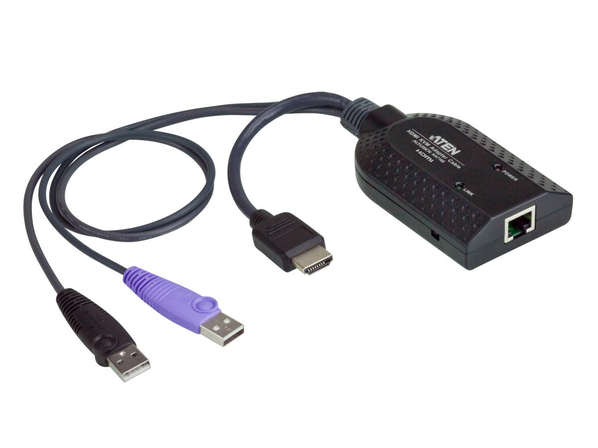 ATEN KA7168. Tastatur porttype: USB, Video porttype: HDMI, Produktfarve: Sort. Vægt: 104 g. Stik: 1 x RJ-45, 2 x USB A, 1 x HDMI, Dybde: 91 mm, Højde: 21,2 mm