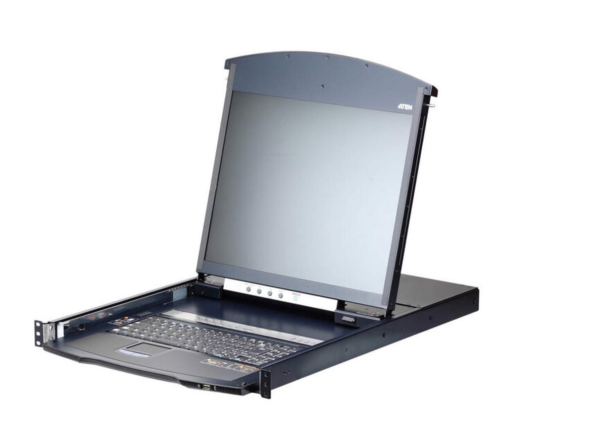 ATEN's KL1116VN 16-port Cat 5 Dual Rail LCD KVM over IP Switch features an independently retractable, dual slide 19" LED-backlit LCD monitor and keyboard with built-in touchpad.