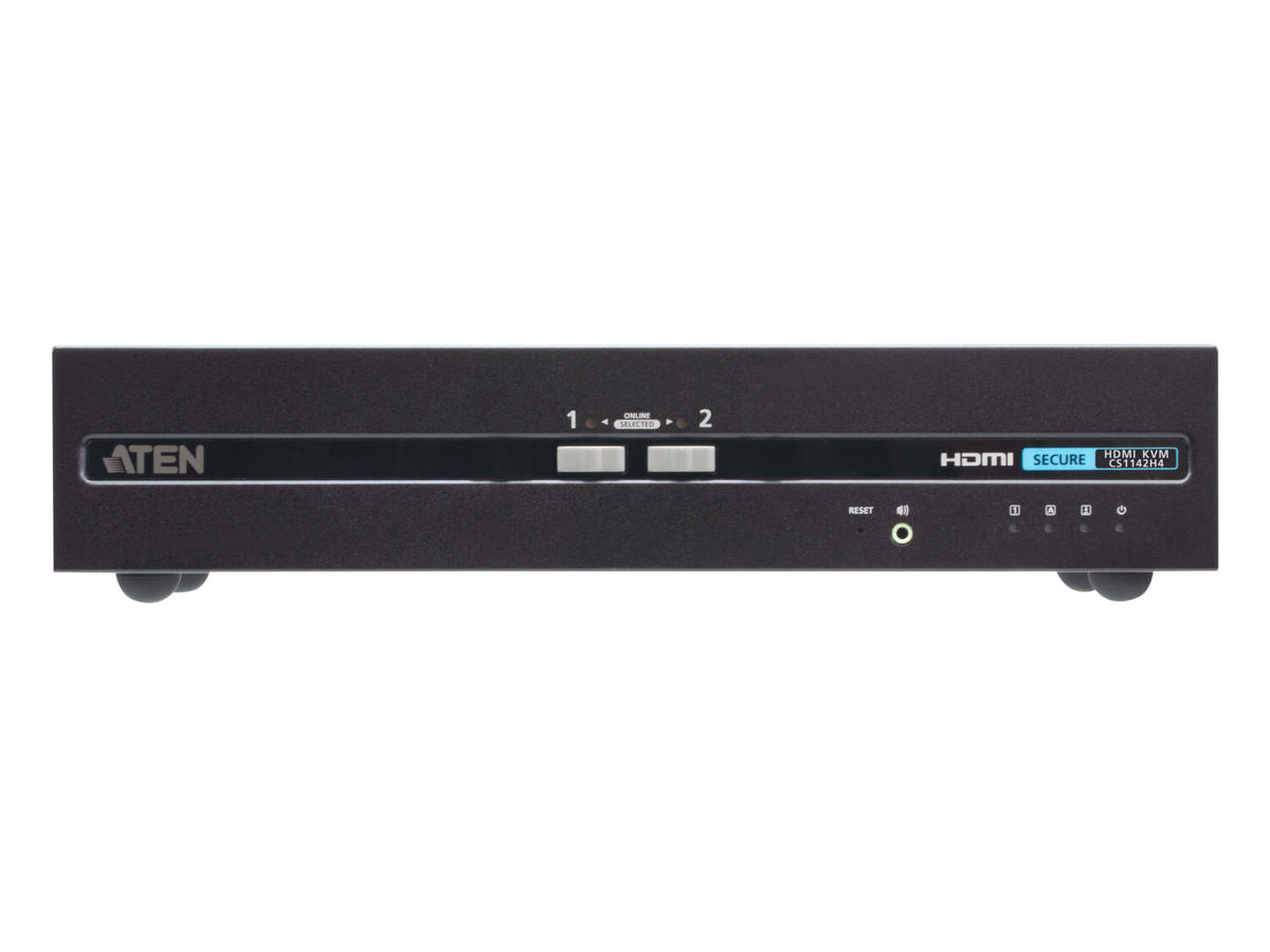 ATEN PSD PP v4.0 Secure KVM Switch CS1142H4 provides isolation between computer sources and peripherals while sharing a single keyboard, mouse, monitor, and speaker set between connected computers of various security classifications. Compliance with PSD PP v4.0 ensures peripheral sharing capabilities provide maximum user data security when switching port focus, preventing unauthorized data flows or leakage between connected sources. Key protections include isolation and unidirectional data flow, restricted peripheral connectivity and filtering, user data protection, configurable device filtration and management, strict audio filtration, and always-on tamper-proof design, keeping sensitive assets isolated and providing advanced security and a user friendly design for instantly secure deployment.