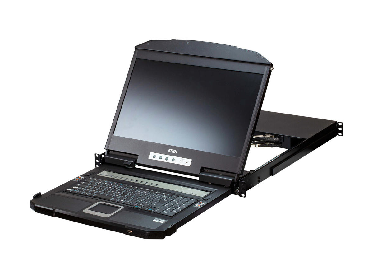 The ATEN CL3884NW LCD KVM Switch offers a space-saving, streamlined approach to KVM switch technology by integrating a keyboard, a 18.5" LED-backlit LCD monitor, and a touchpad in a 1U rack-mountable slide housing. The dual rail design enables the LCD monitor, keyboard and touchpad to operate independently of each other. To maximize space utilization, the keyboard and touchpad modules can slide back to "hideaway" when not in use, while the LCD monitor rotates back, flush against the rack, to allow convenient monitoring of computer activity.