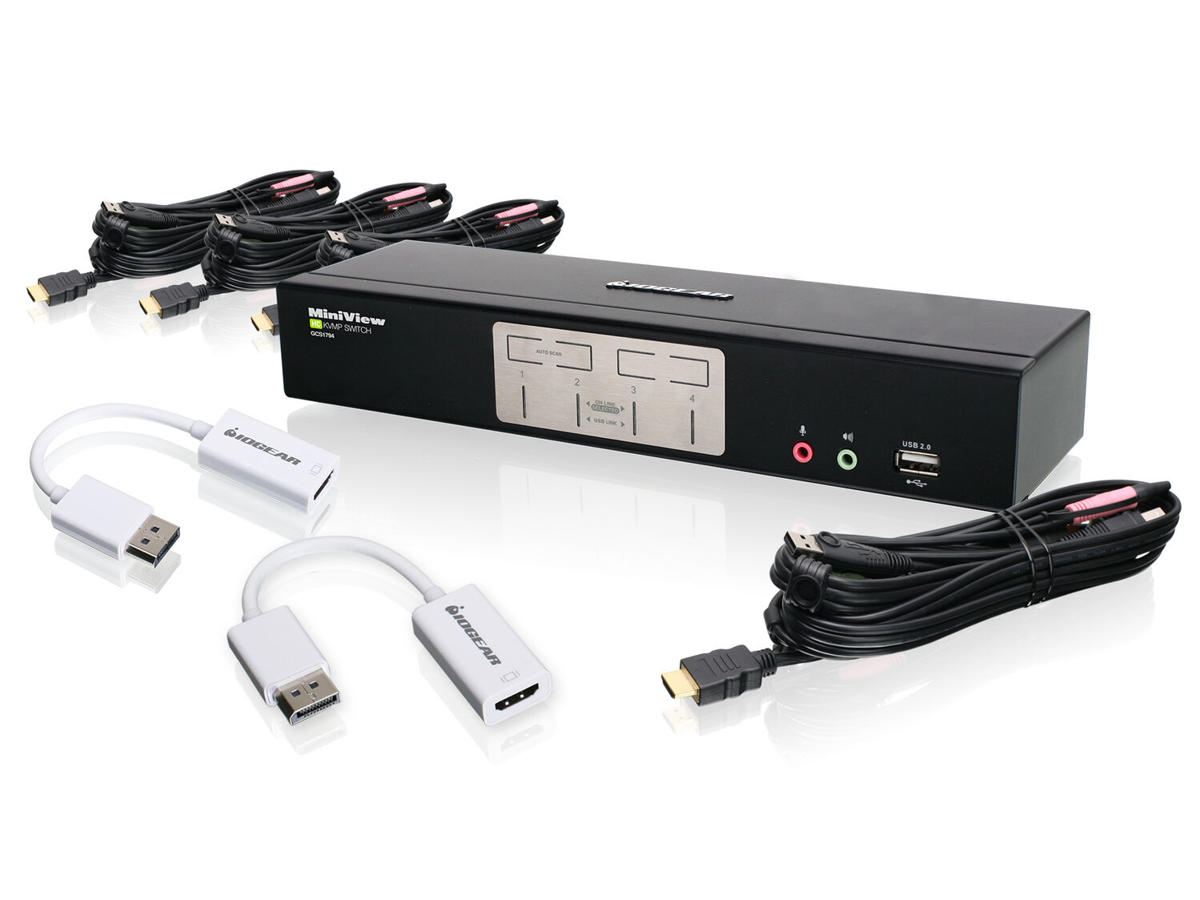IOGEAR's HD and DisplayPort KVM Solution enables effortless control over 4 HDMI or DisplayPort computers using a single USB keyboard, USB mouse and single high definition display (720P or 1080P) or HDTV. This bundle is perfect for a home office or small / medium size business, as it offers the flexibility of choosing between HD and/or DisplayPort connections. Take advantage of your existing computers, and use the included DisplayPort adapters to display content from your DisplayPort enabled devices on a large external HDMI display or HDMI projector.