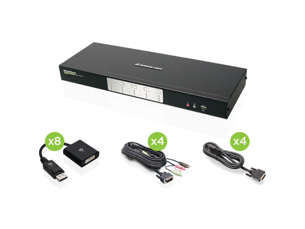 IOGEAR's 4-Port Dual Monitor Dual-Link DVI KVMP with Adapters Kit is a Plug-N-Play solution, eliminating the need to download any software or drivers. Easily switch between the 4 connected computers with either hotkeys, front push buttons, or a 3-button mouse (mouse emulation must be on). This 4-Port Dual Head (Dual Monitors) Dual-Link DVI KVMP also features two USB 2.0 peripheral ports for asynchronously sharing USB devices between your computers. A powered USB hub may be attached to the peripheral ports for added functionality. The KVMP includes a 3.5mm 2.1 audio and microphone port; perfect for as a desktop solution. Offering a complete out-of-the-box solution, this dual head KVMP is a straight forward computer switch solution for DVI and DisplayPort connections. -