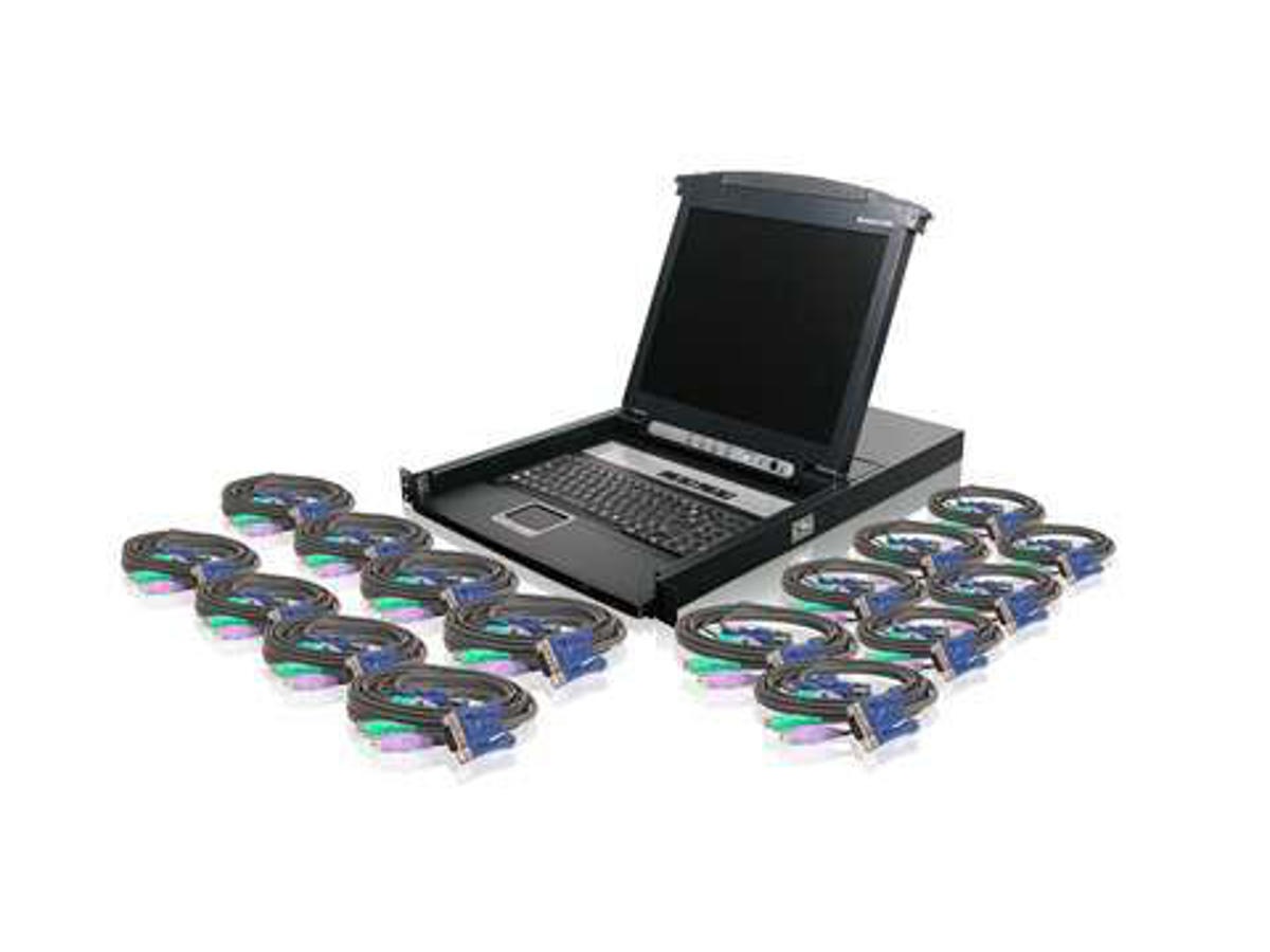 IOGEAR’s GCL1816KITP is an integrated LCD console and 16 port KVM (keyboard, video, and mouse) switch with bundled PS/2 KVM cables that offers secure access to 16 VGA, PS/2 computers. It features a convenient rack mountable sliding / retractable 17" TFT LCD active matrix monitor and keyboard with built-in touchpad for a space-saving and streamlined integration. For added convenience it also supports an external USB mouse. An extra USB / PS/2 console port is provided on the rear panel to manage the LCD KVM switch from an external console (monitor, keyboard, and mouse). All this in a universal 1U rack mount space.