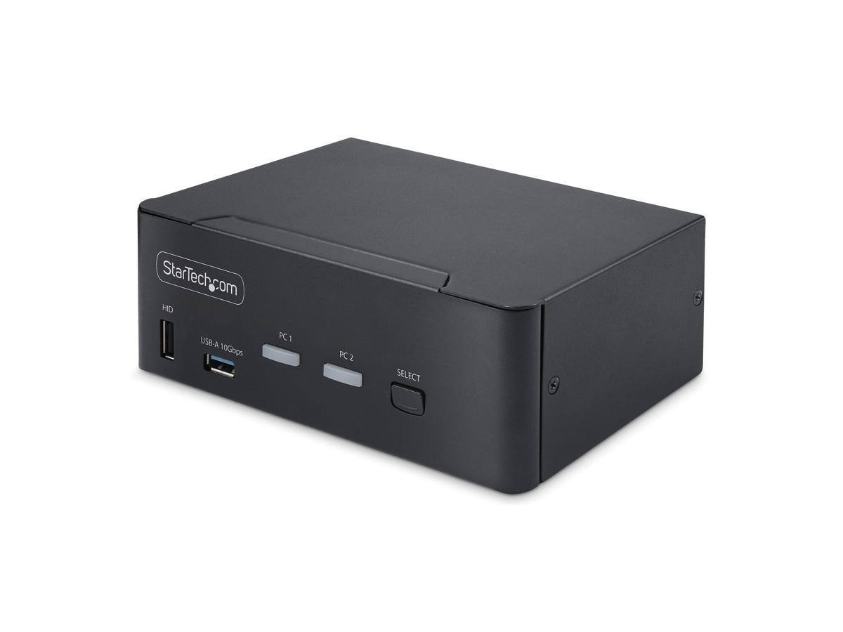 This dual-monitor KVM switch allows users to switch between two USB and DisplayPort-enabled desktops. It allows for sharing of dual-8K 60Hz DisplayPort monitors, a keyboard and mouse, and two USB 10Gbps devices.