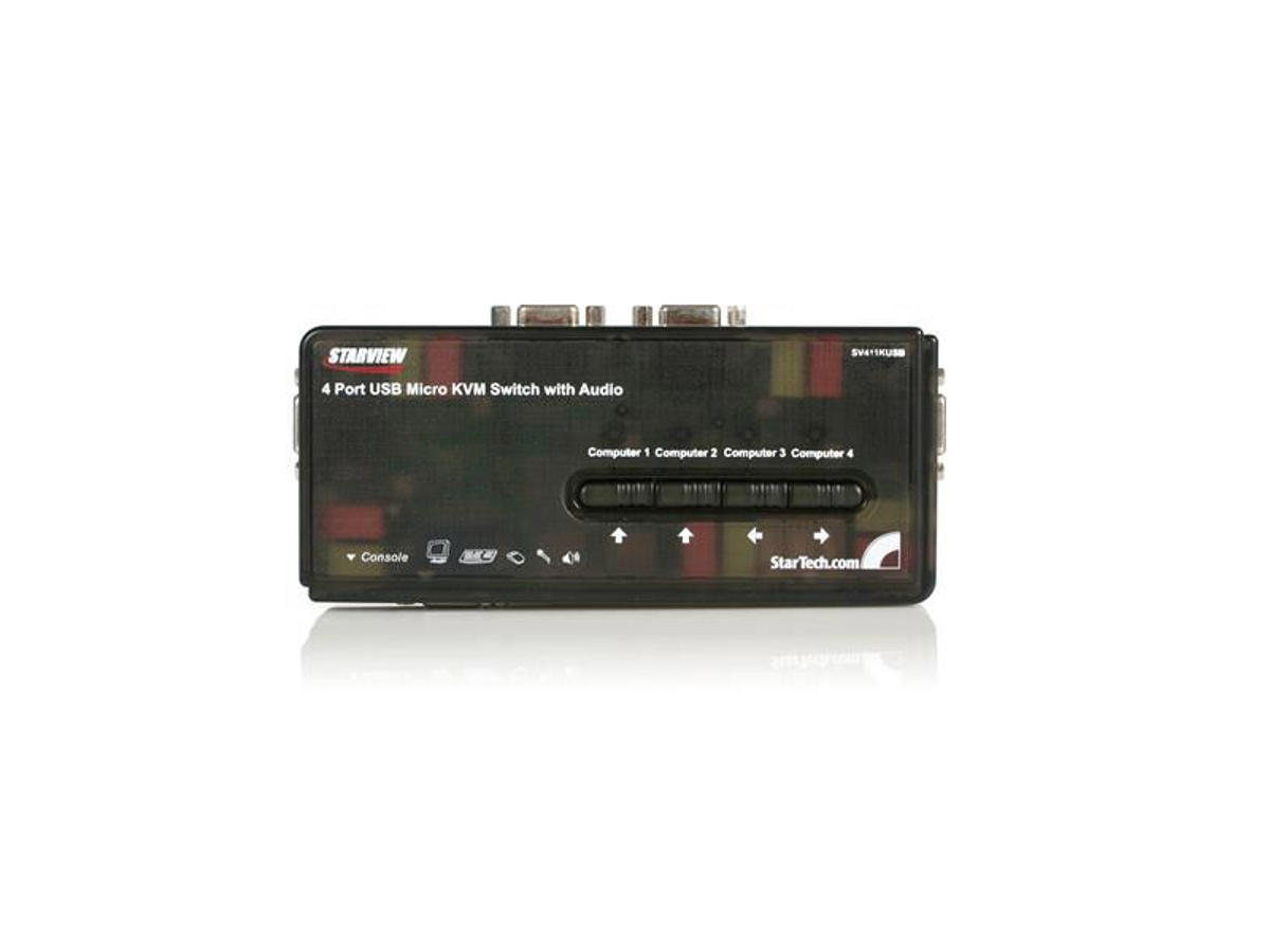 The SV411KUSB 4 Port USB KVM Switch Kit with Audio and Cables lets you control up to four USB-enabled computers using a single keyboard, mouse and VGA monitor and offers both hotkey and top panel push-button operation for simple switching between connected computers. Designed to integrate seamlessly into any environment, the USB KVM switch offers a small footprint design (roughly the size of a deck of playing cards) and draws power from the connected computers, so it doesn't require an external power supply. A suitable solution for virtually any application, the USB KVM switch supports video resolutions of up to 2048 x 1536 as well as audio switching. The USB KVM switch includes four, 4ft 4-in-1 VGA and USB Host Cables, providing everything needed for quick installation to provide a complete, out-of-the-box KVM solution. Delivering dependable and convenient control of multiple computers from a single peripheral station, the KVM switch is backed by a StarTech.com 2-year warranty and free lifetime technical support.