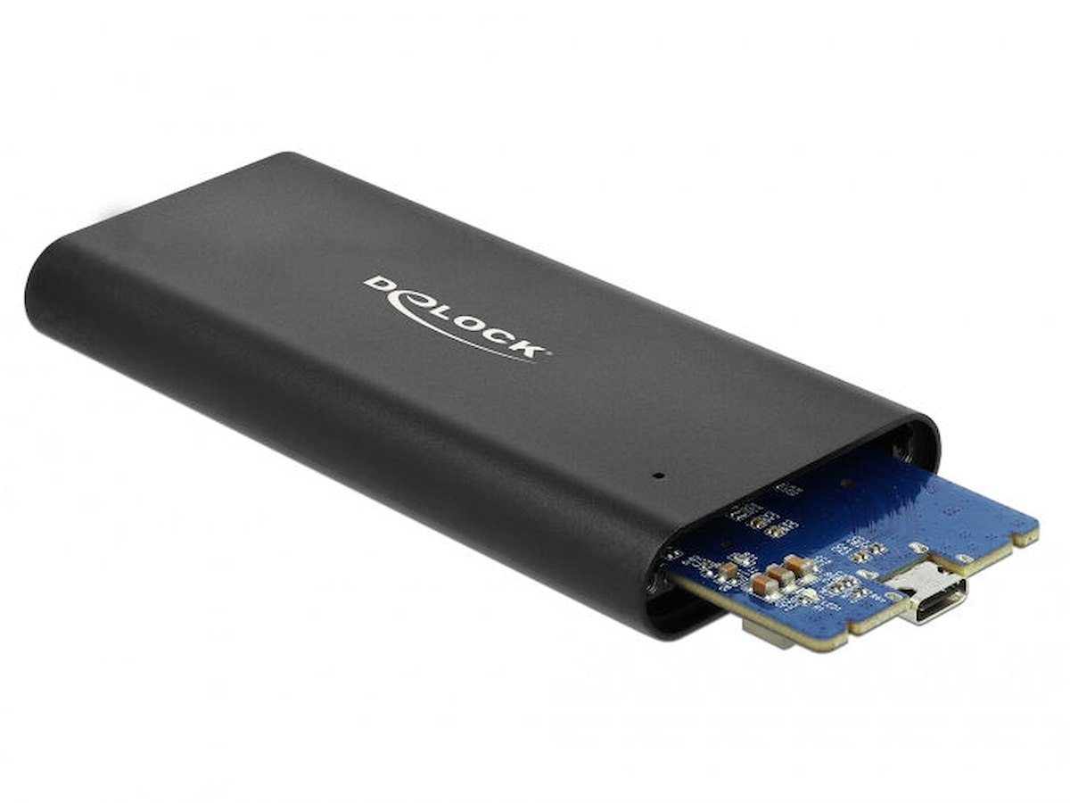 DeLOCK 42614. Produkttype: SSD kabinet. Antal understøttede lagerdiske: 1, Understøttede lagerdrev brugerflader: M.2. Dataoverførselshastighed: 10 Gbit/sek.. Produktfarve: Sort. USB-stik type: USB Type-C