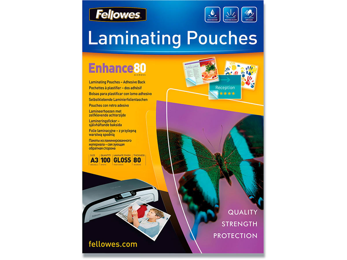 Lamineringslommer, A3, 80 micron, 100 stk, Fellowes Selvklæbende bagside Gloss