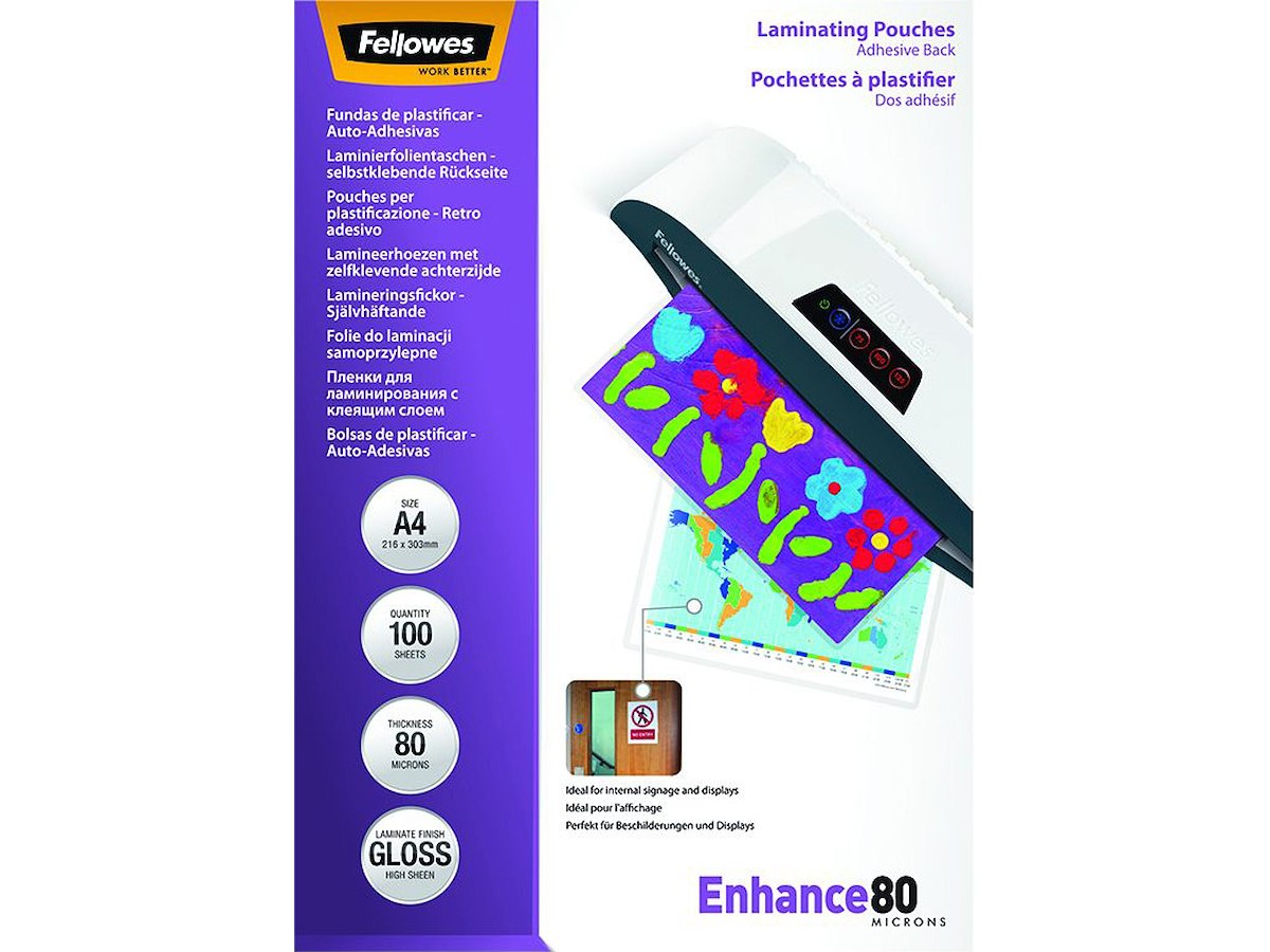 Lamineringslommer, A4, 216x303 mm, 80 micron, Fellowes Selvklæbende bagside Gloss