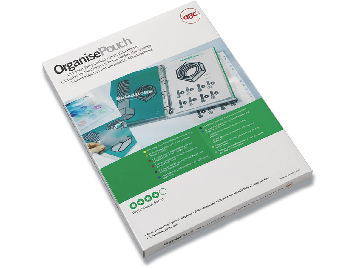 Organise lamineringslommer er designet til at beskytte referencedokumenter, der anvendes regelmæssigt, og de er forhullede, så de færdige dokumenter er klar til at blive arkiveret i ringbind med to eller fire huller. De fås i forskellige udgaver med en flot glans eller matteret overflade.