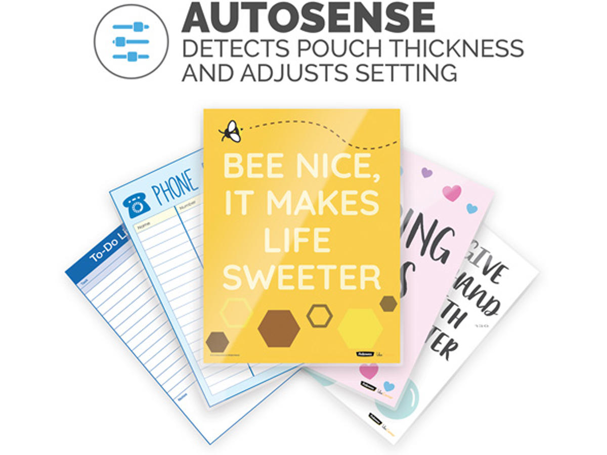 - AutoSense, som registrerer lamineringslommens tykkelse og automatisk vælger den rigtige hastighed.