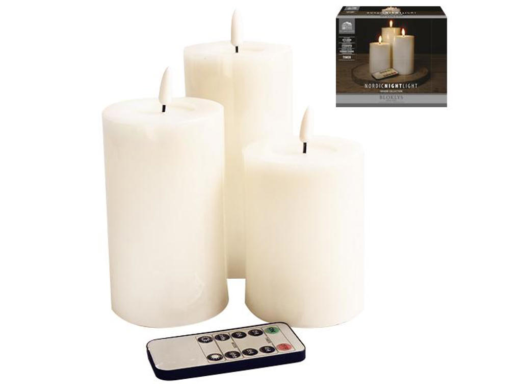 Bloklys, 3 stk, LED, Hvid, H10/12/15 x Ø7,5cm, incl. fjernbetjening