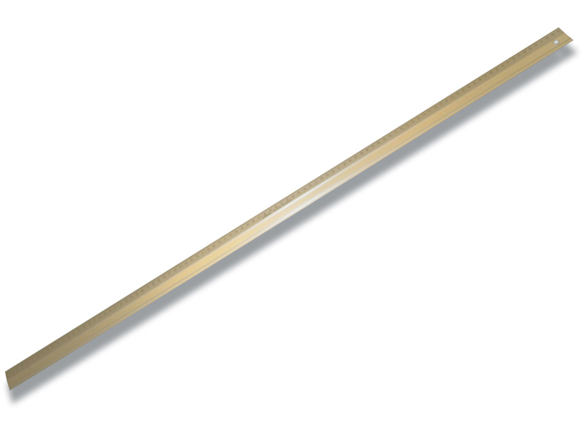Længden på skærelinealen 100 cm og linealen er inddelt i mm med en 0-100 cm skala.