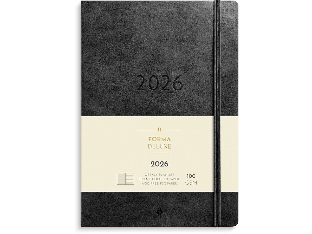 En stilren og eksklusiv kalender med fokus på tydelig planlægning. En klassisk kalender med cremefarvet papir med en uge pr. opslag, hvor venstresiden har linjerede sider til noteringer, og højresiden har timeinddeling. Bagerst er der ekstra sider til noteringer og en letoverskuelig årsplanner.
