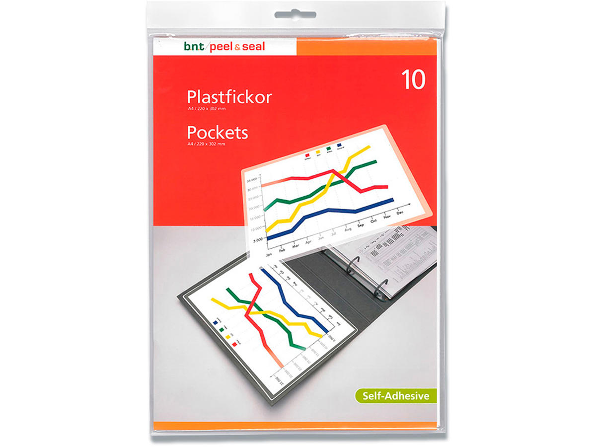 10 stk Selvklæbende dokumentlommer i plast med åben kortside (10 stk A4). Kan bruges til skiltning på flade overflader eller som ekstra lomme til løst papir i ringbind, puder eller mapper.