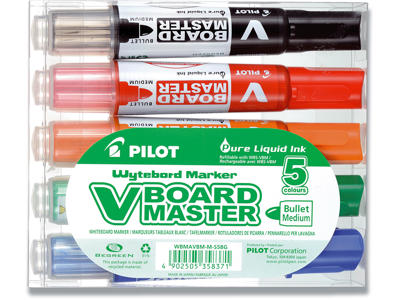 Whiteboard marker, Rund spids, 5 farver, 1-3 mm, Pilot V Board Master WBMA-VBM-M-S5-BG