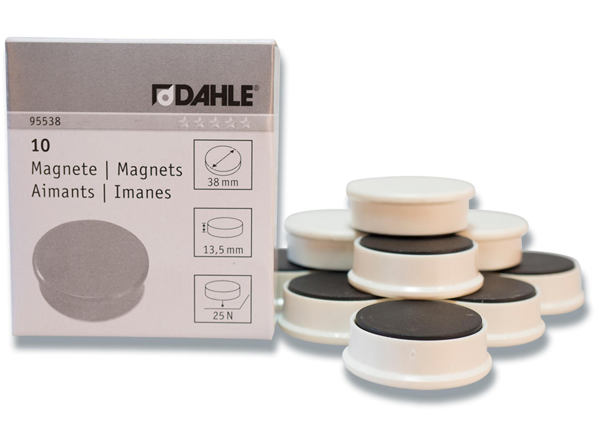 Magneter der passer perfekt til køleskabe, whiteboards og magnetiske planlægningstavler. Dahle runde magneter har hvid farvet overdel og en diameter på 38 mm. Magneterne er både velegnet til ophængning af postkort, opskrifter, huskesedler og større mængder papir. En æske indeholder 10 stk. hvide Dahle magneter, der ligeledes forhandles i farverne: rød, gul, grøn, blå og sort.