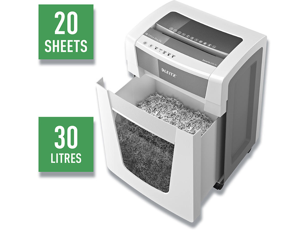Den nye Leitz IQ Office Pro makuleringsmaskine giver det ultimative i stil, ydelse og sikkerhed. Med sikkerhedsniveau DIN 4 skær. Perfekt makulering hvergang - ideel til kontorbrug. Højt sikkerhedsniveau og fremragende resultat med denne blokeringsfri, stille og langtidsløbende makuleringsmaskine. Makulerer 20 ark A4 til krydsmakuleringsstykker. Med stor 30 liter beholder. Enkel at bruge med touch kontrolknapperne. Makulerer i meget lang tid med klassens førende 4 timers løbetid. En komplet uafbrudt makuleringsoplevelse.