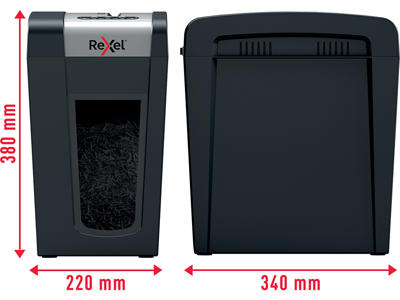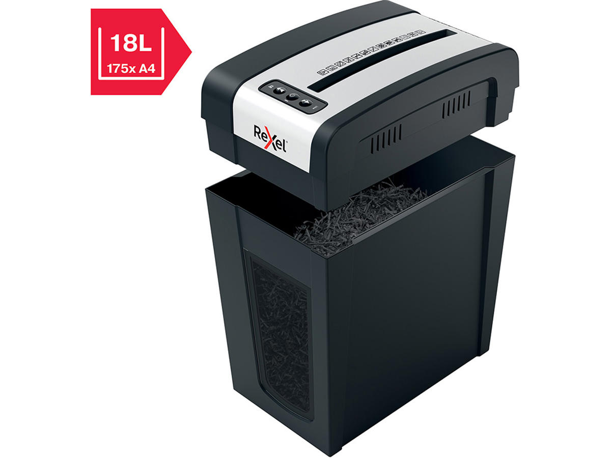 - Affaldsbeholder med 18 liter kapacitet (175 A4 ark). Hoved kan løftes af for let tømning. Vindue, så det er let at se, når maskinen skal tømmes.