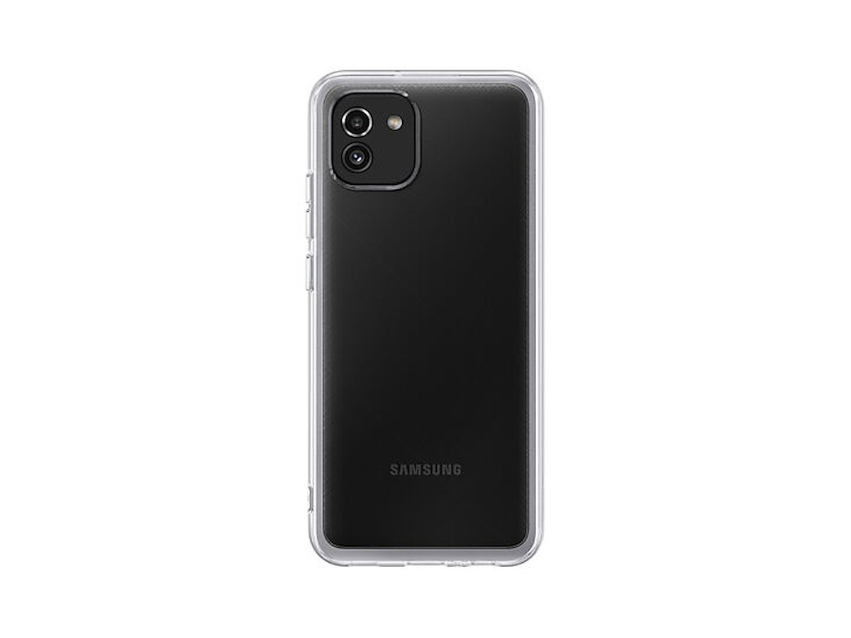 Samsung EF-QA036TTEGEU. Etui-type: Cover, Mærke kompatibilitet: Samsung, Kapabilitet: Galaxy A03, Maksimal skærmstørrelse kompatibilitet: 16,5 cm (6.5"), Overfladefarvning: Monokromatisk, Produktfarve: Transparent