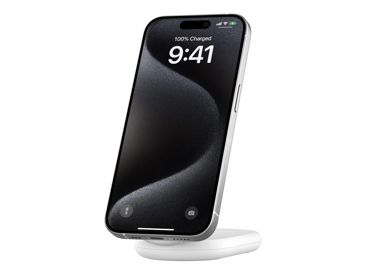 Our versatile Qi2 wireless charger is engineered with a durable hinge to be used as a stand or lay flat as a pad. Charge as you like, view your iPhone in stand mode, and fold up for compact storage.