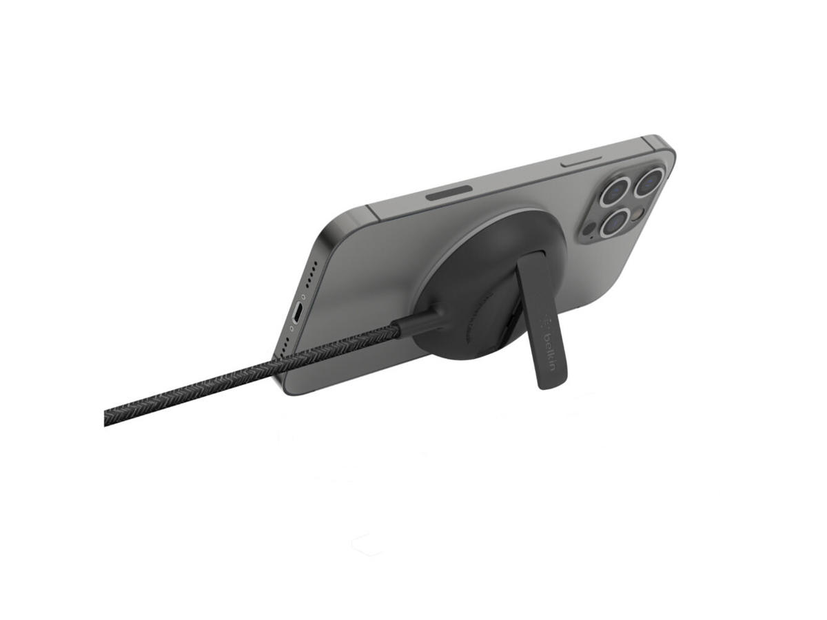 This portable wireless charger pad was engineered with official MagSafe technology to deliver fast wireless charging up to 15W for the iPhone 13 and iPhone 12, and allows you to keep using your phone while it charges thanks to a thoughtfully designed pop-up stand and an extra-long cable. The magnetic attachment ensures perfect, snap on alignment every time, while a slim, lightweight design makes this charger perfect for travel, and three understated colorways fit seamlessly into any home or office space.