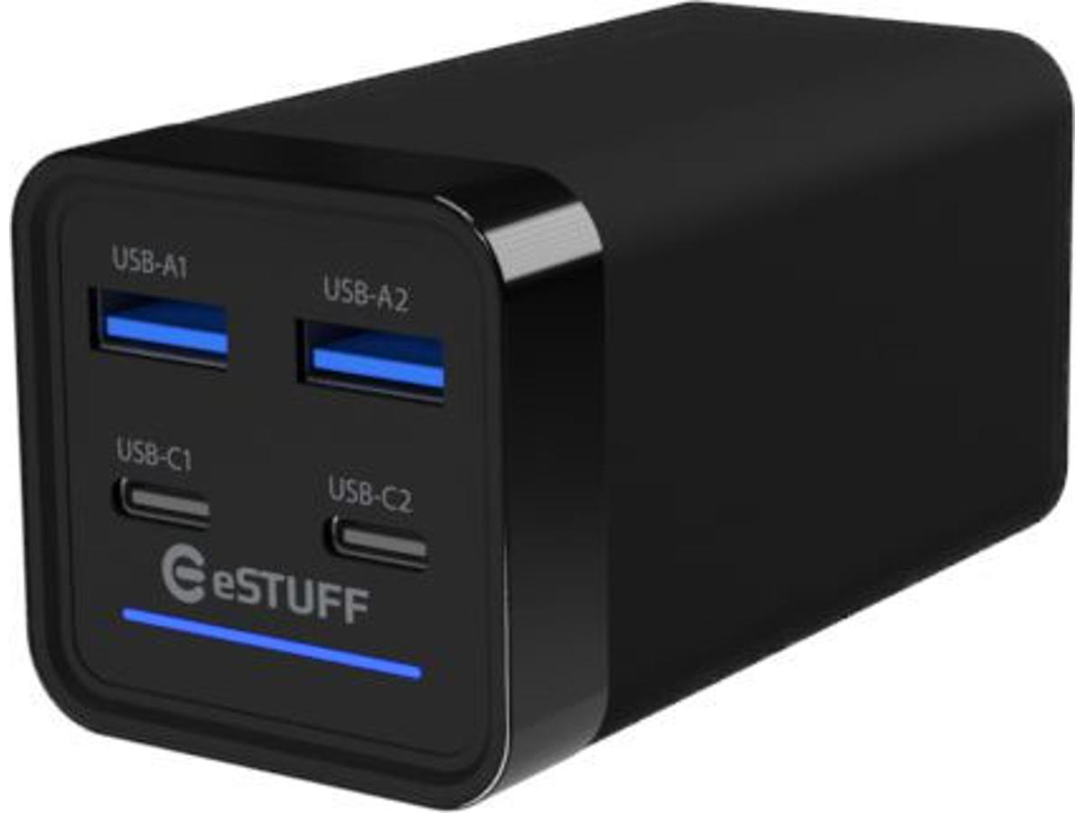 eSTUFF ES635200. Oplader type: Indendørs, Strømkilde type: Vekselstrøm, Oplader, kompabilitet: Laptop, Smartphone, Tablet, Universel. Indgangsspænding: 100 - 240 V. Antal USB type-C-porte: 2. Produktfarve: Sort