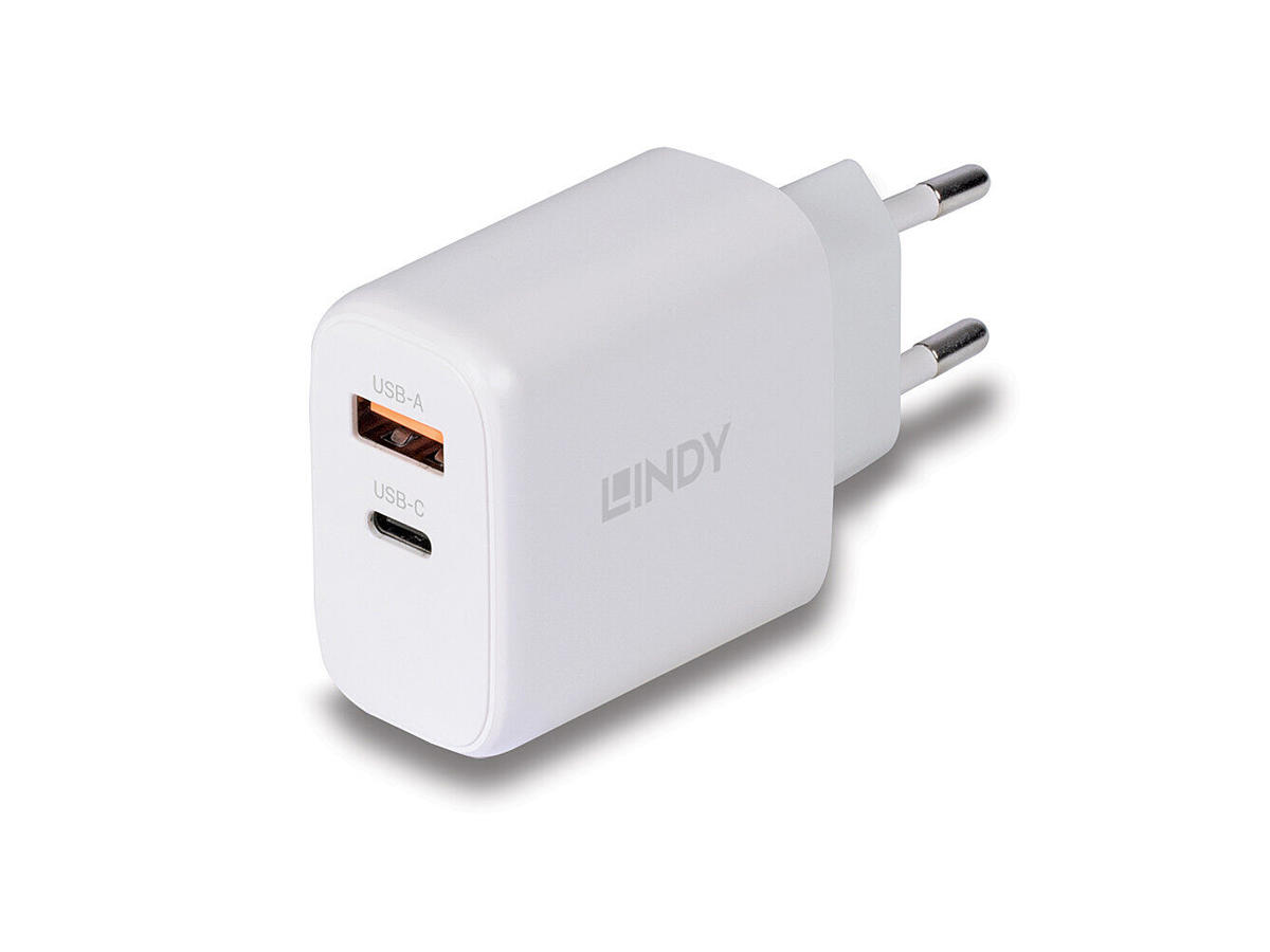 The Lindy 65W USB Type A & C GaN Charger can charge two devices simultaneously. 65W Power Delivery and PPS are supported by the USB Type C port while the USB Type A port provides fast charging with up to 45W. When both ports are used in parallel a maximum power of 20W will be provided.