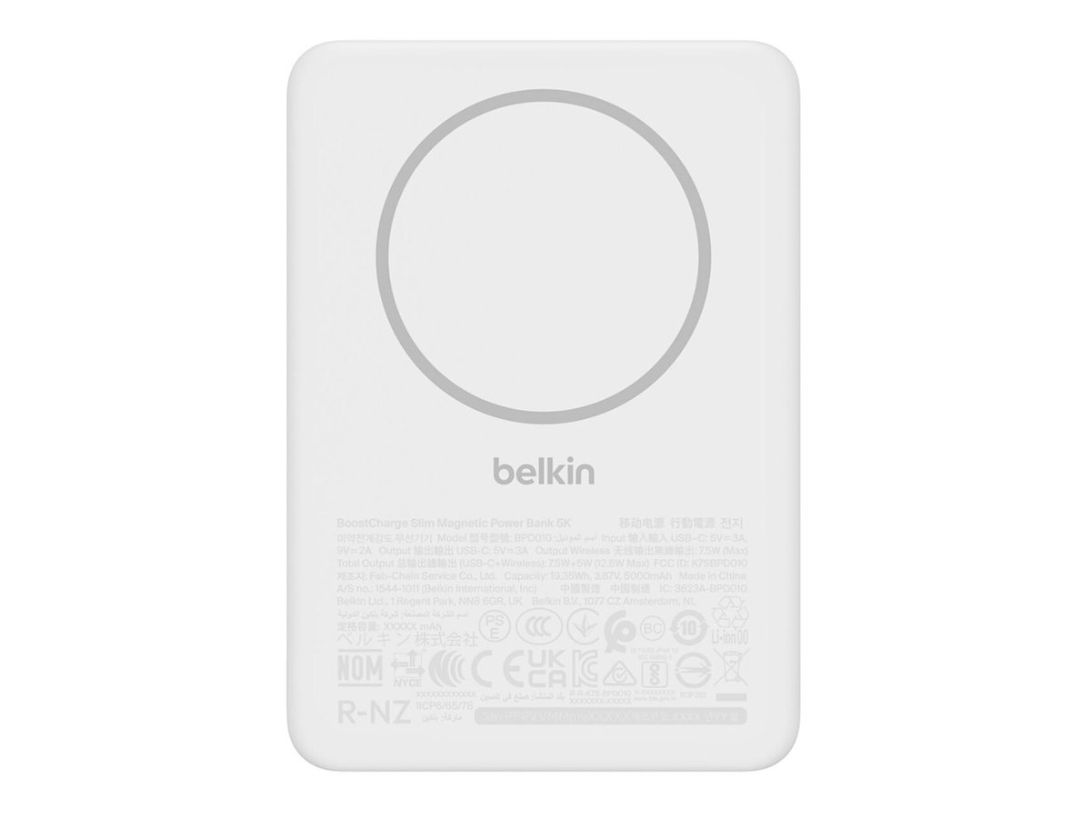 Belkin BPD010hqWH. Batterikapacitet: 5000 mAh. Antal USB type-C-porte: 1. Trådløs opladning. Total udgangseffekt: 7,5 W. Produktfarve: Hvid