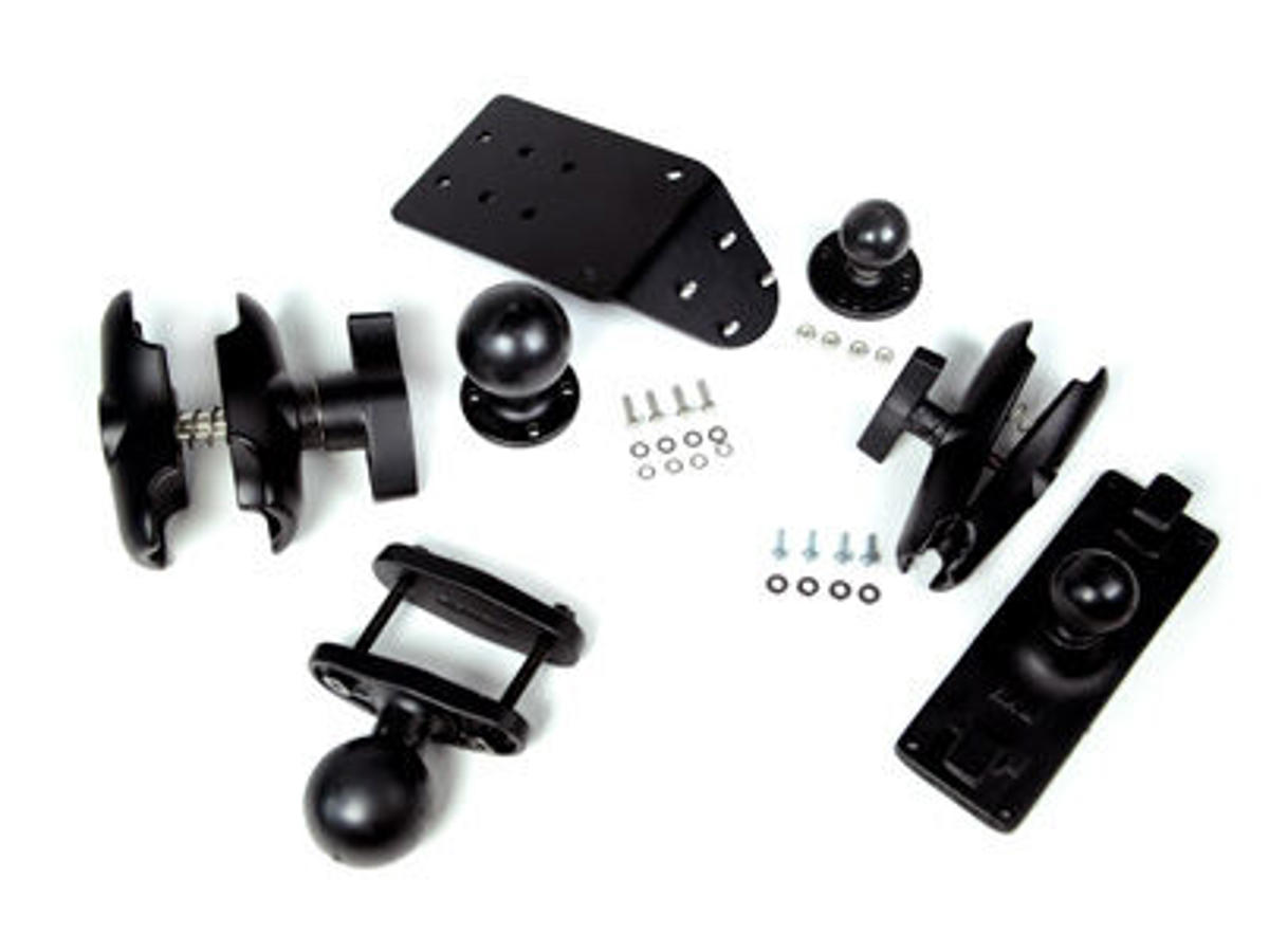 RAM mount kit for computer and keyboard; computer mount includes clamp base "D" ball , short "D" arm 5 in. (128 mm), "D" ball for vehicle dock rear. Keyboard mount includes dock plate, "C" ball for dock plate, "C" arm 5.7 in. (145mm), keyboard mount plate with "C" ball.