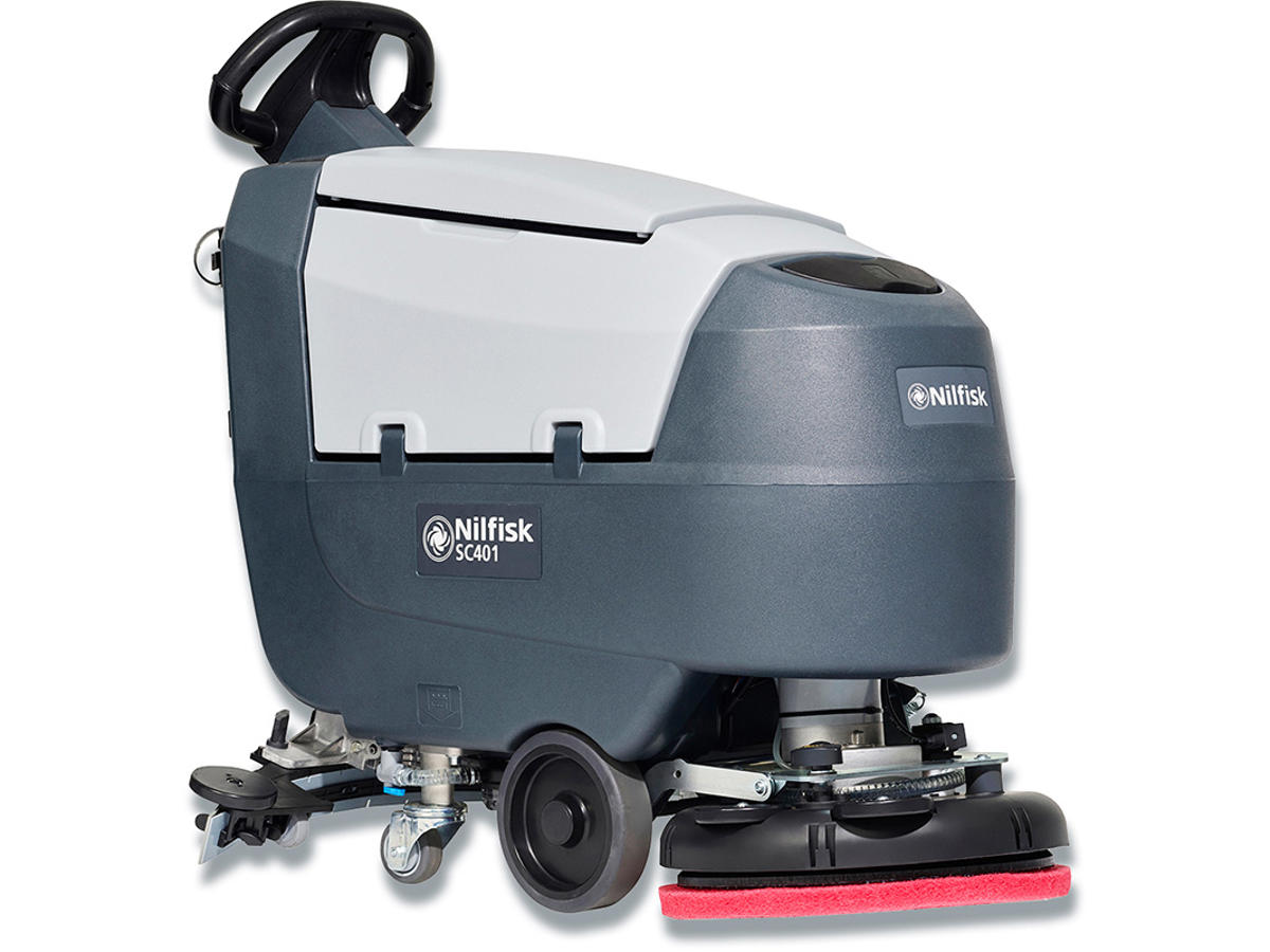 Den kompakte Nilfisk SC401 giver dig den hurtighed, nøjagtighed og brugervenlighed, du har brug for til bedre rengøring af gulve. Samtidig har den effektive maskine et ekstremt lavt lydniveau, så rengøringen kan gennemføres i dagtimerne – selv i lydfølsomme områder. SC401 er designet og fremstillet med vores afprøvede og godkendte Nilfisk teknologi, og øger produktiviteten i den daglige rengøring, f.eks. i kontorer, butikker, hoteller, skoler, hospitaler og værksteder. Den høje og ensartede ydelse sikres af det 43 cm brede børstedæk der kan udstyres med børste eller rondel. Takket være den buede letvægtssugefod, efterlades gulvet altid helt tørt - og den effektive rengøringsydelse holder i lang tid: Op til 4 timers kontinuerlig vask og optørring på et fuldt opladet batteri, og op til 100 minutter før rentvandstanken skal genopfyldes. Maskinen er brugervenlig og kræver ganske lidt træning. De 4 hjul gør SC401 nem at manøvrere, og OneTouch™ -knappen aktiverer alle funktioner med et enkelt klik. Desuden kan rengøringsindstillingerne ændres undervejs med tre enkle knapper på betjeningspanelet. Maskinen kan leveres i en batteridrevet version eller med ledning. Batteriudgaven er også tilgængelig med køremotor, der sikrer en bedre ergonomi og komfort for brugeren. Indbygget lader, batteri & vaskebørste.