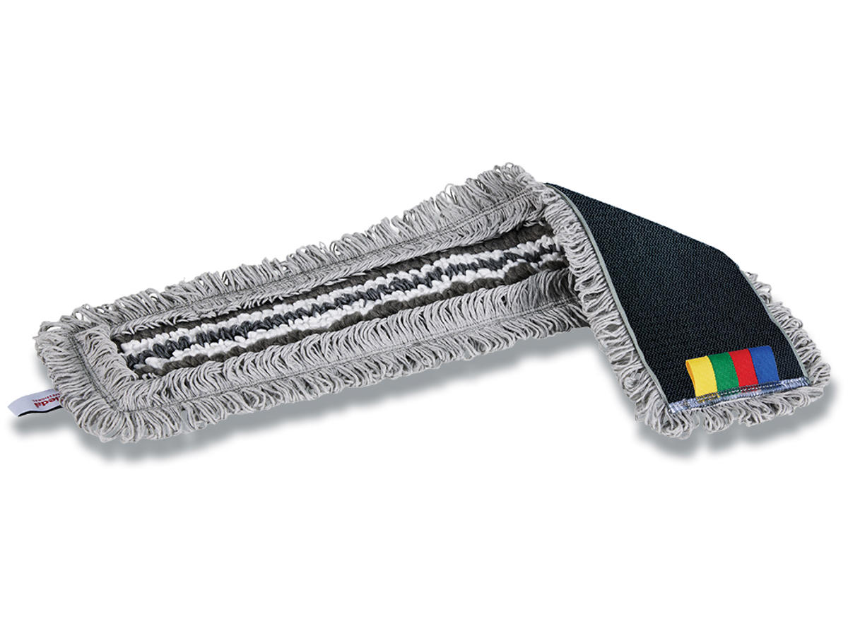 Moppens konstruktion inkluderer kraftigt burrebånd (velcro), der sikrer en pålidelig fastgørelse til fremføreren. Den er udstyret med fire rengøringszoner, der arbejder i harmoni for at maksimere rengøringseffektiviteten:
