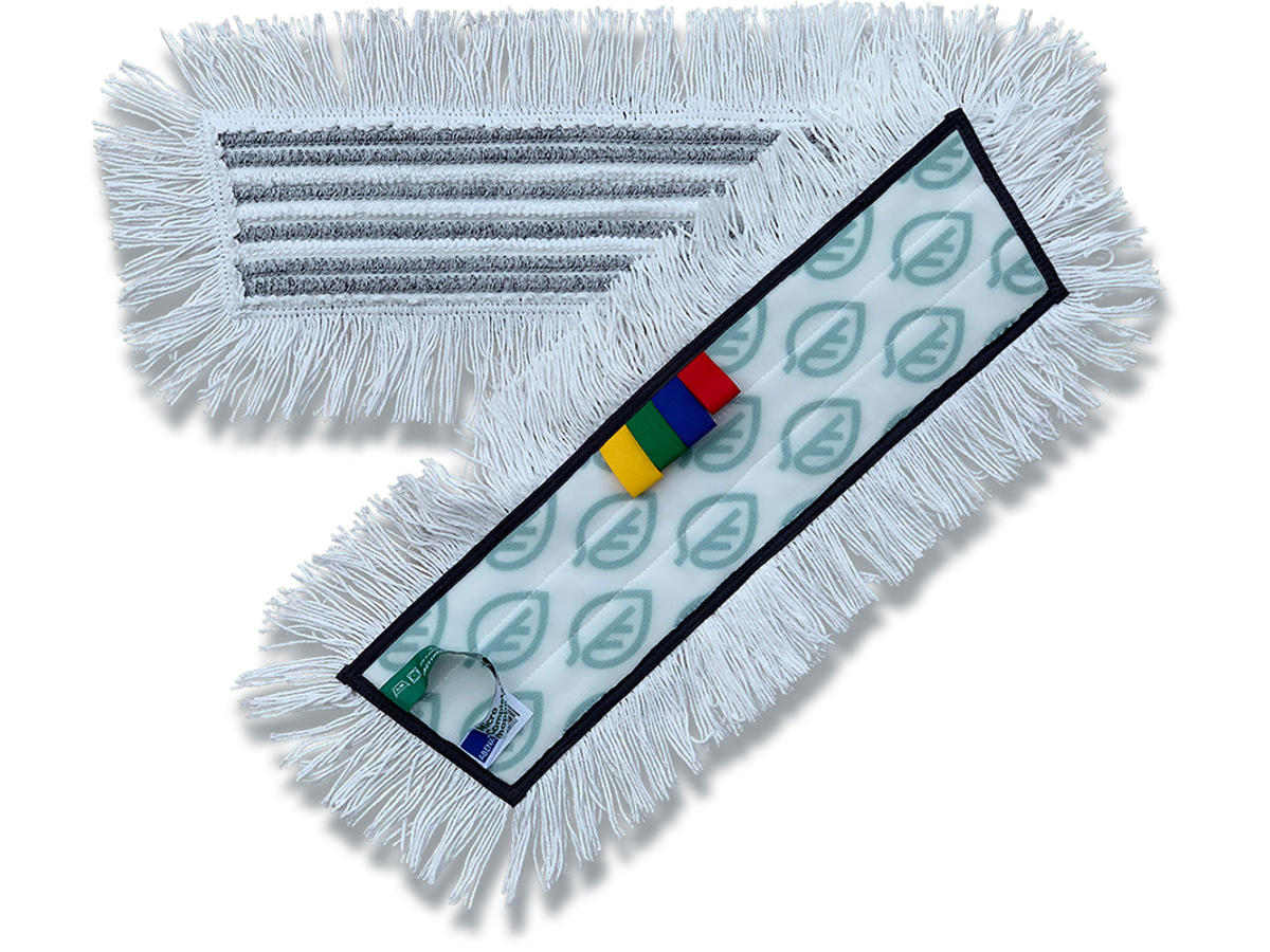 Svanemærket mikrofibermoppe der har dokumenteret bakterieopsamlingsrate på 99,9%. Se testrapport under datablade – øvrige produktinformationer. Hårdt vævet garnmoppe med opskårne kantfrynser, der opsamler snavs langs kanter og ved bord- og stoleben. Den hårde vævning af garnet gør moppen til det oplagte valg til brug på gulve med meget høj friktion. Moppen er særligt effektiv på gulve af laminat, lakeret træ, linoleumsgulv, fliser, epoxy og gummi. Moppen tåler klor, sprit og desinfektion. Kan vaskes ved 95°C. Kan tørretumbles ved 60°C. Undgå brug af skyllemiddel, da det forringer sugeevnen. Tåler op til 500 vaske. Kan krympe op til 2%.